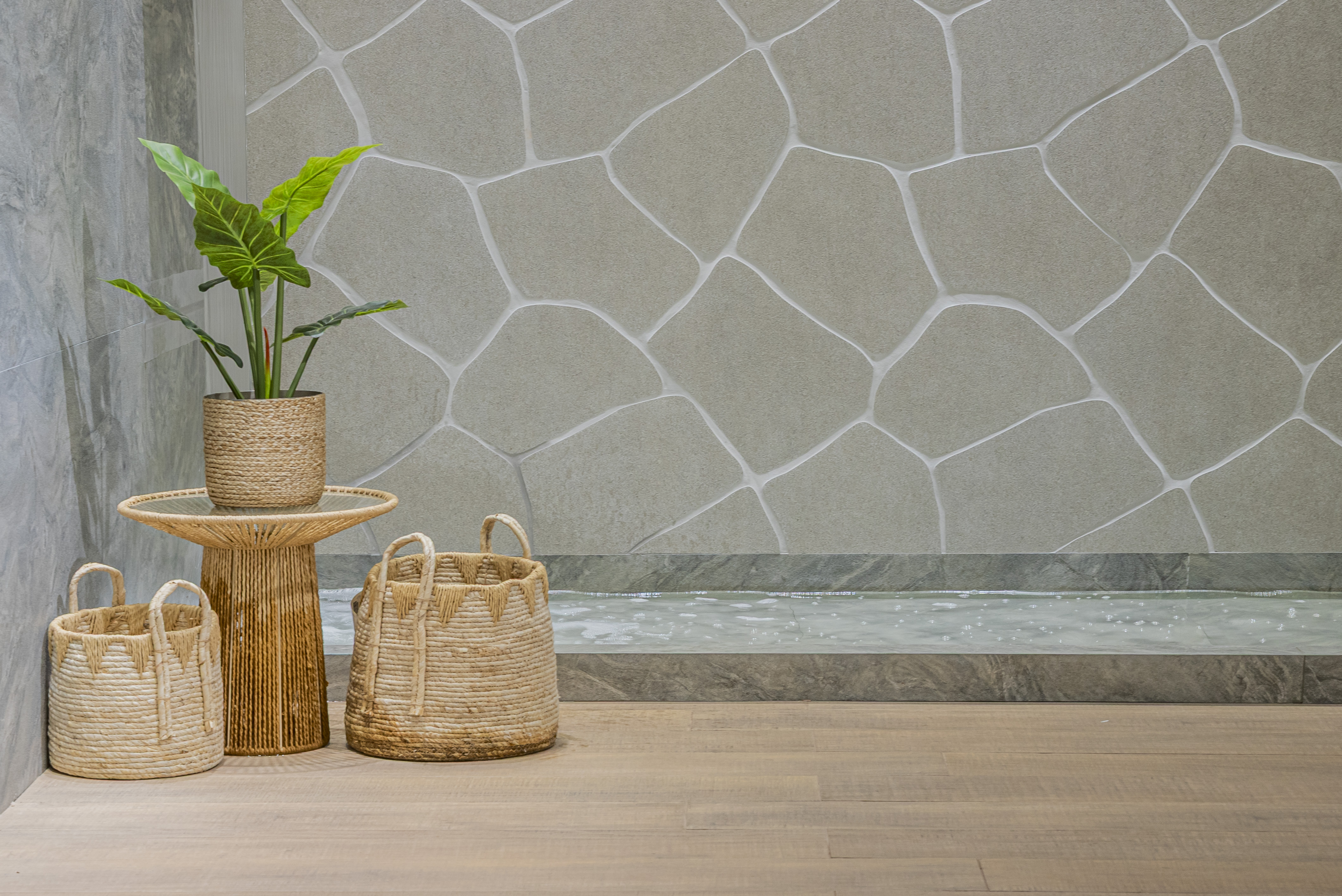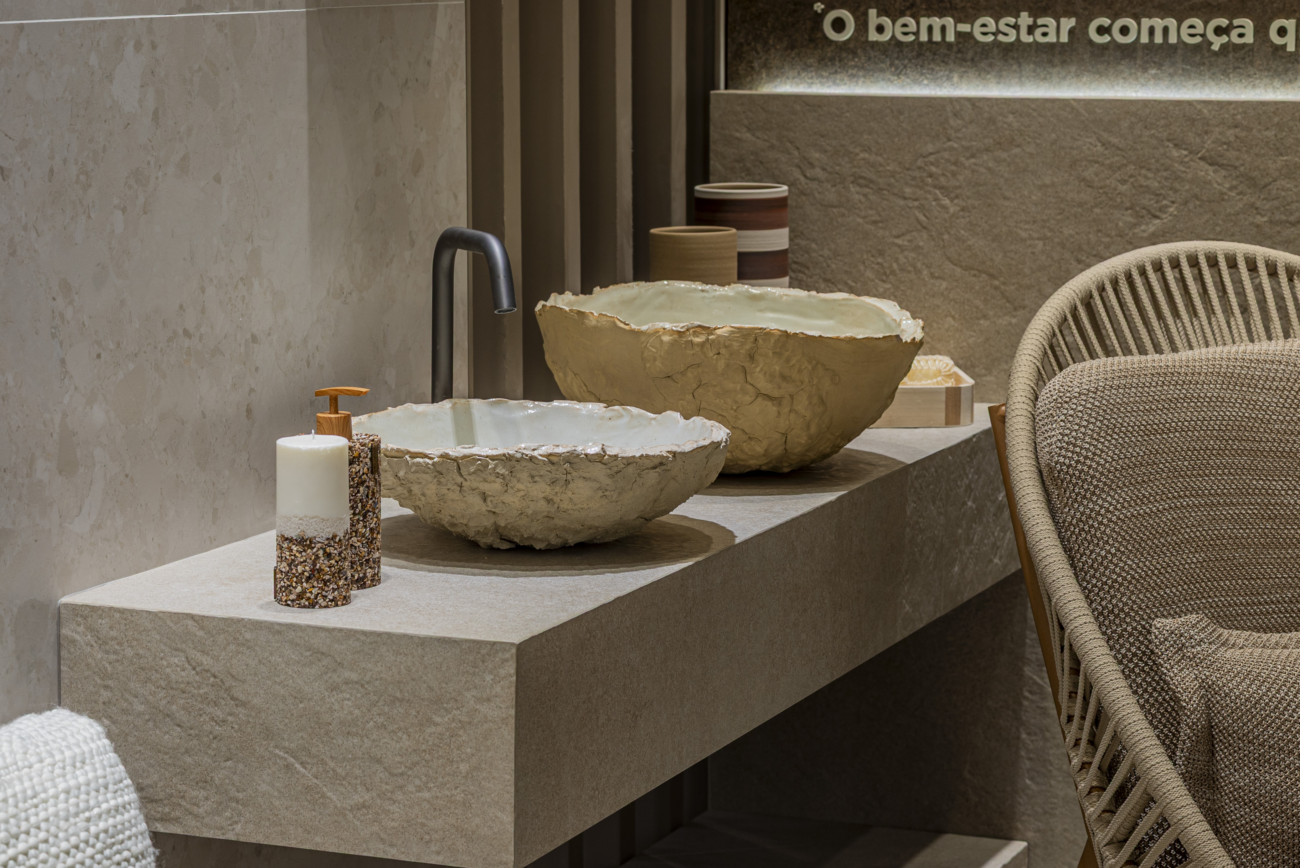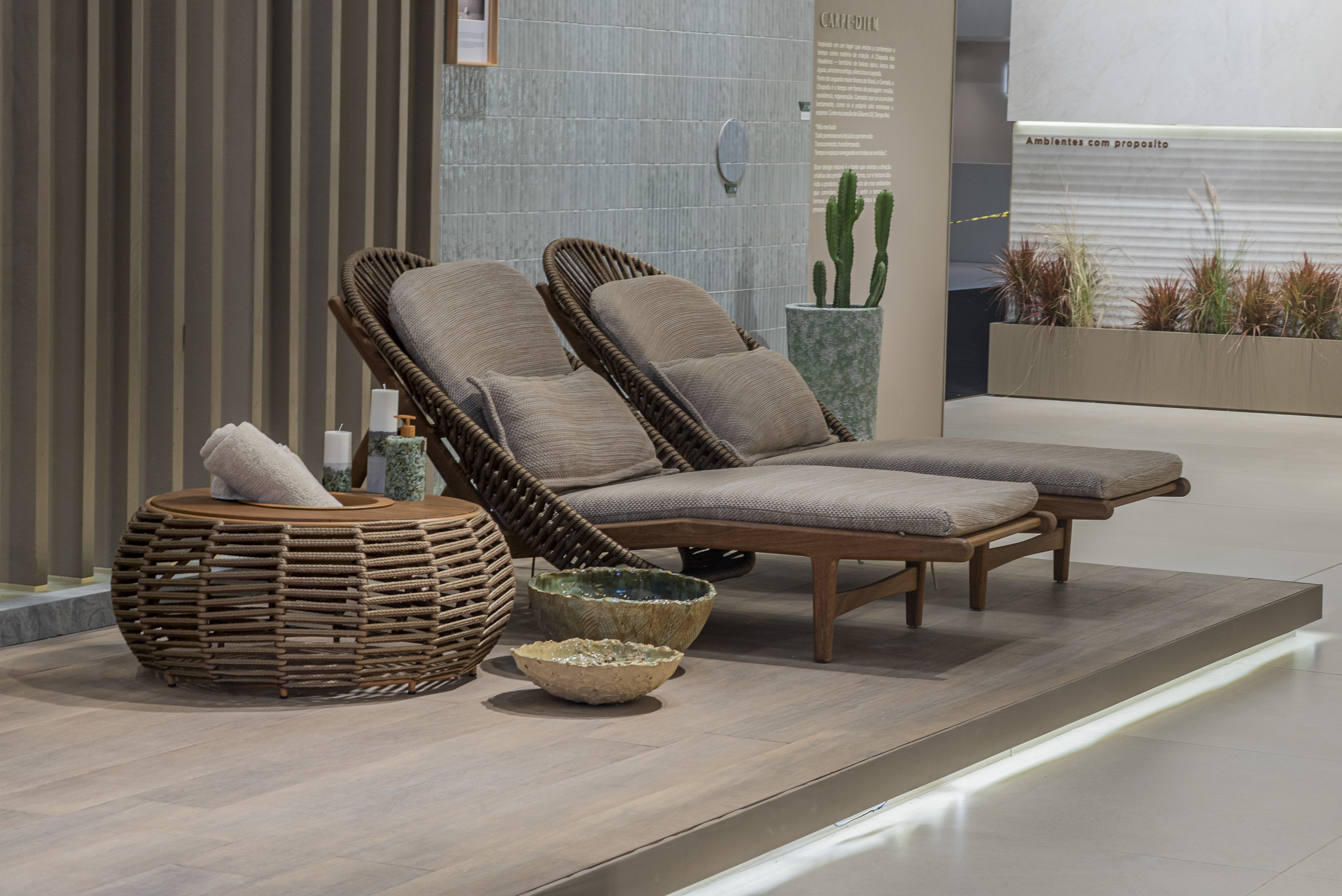Guiada pelas belezas naturais e texturas da Chapada dos Veadeiros, inspirações da coleção autoral Carpe Diem, além da busca por bem viver, pausas e autocuidado, Danielle criou peças autorais que vão além da estética e proporcionam experiências. Cubas, SPA dos pés, revisteiros e objetos que materializam o conceito “feito para sentir”.