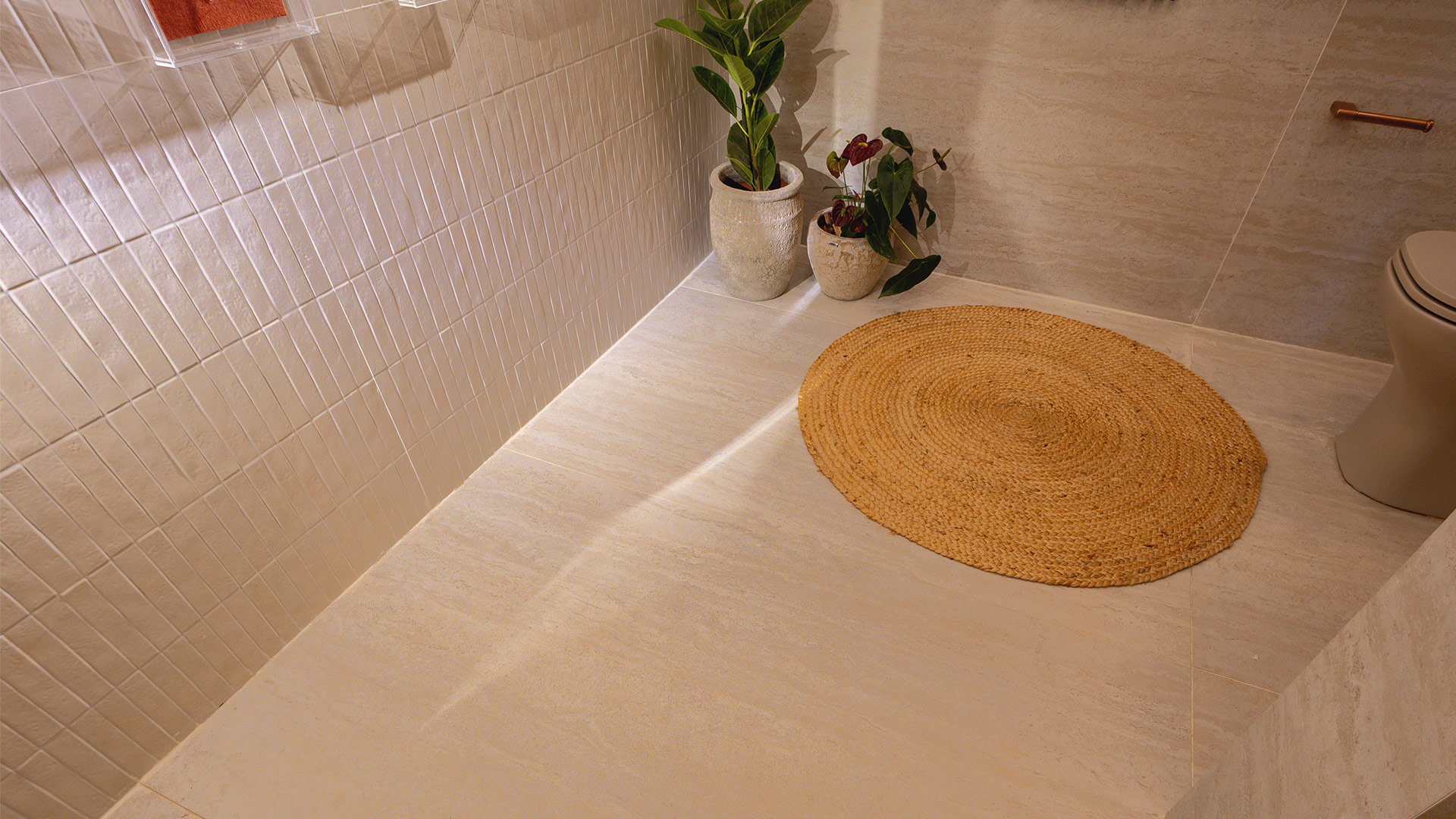 Utilizando os porcelanatos Pietra di Tibur – para compor o chão e parte do lavabo, e Mantova Decor Bianco – para compor parede, Lara explica que “o porcelanato Villagres teve um papel essencial para materializar a atmosfera neutra e elegante que buscávamos”.
