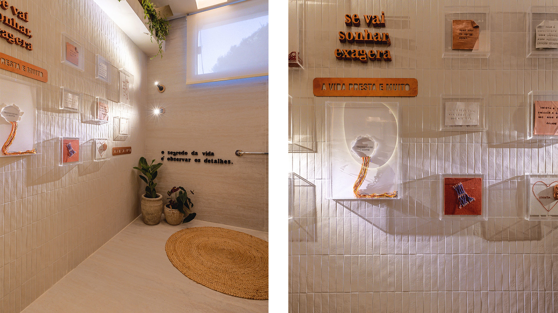O ponto de partida foi a ideia de criar um espaço que traduzisse acolhimento e introspecção, um lugar que pudesse emocionar e ao mesmo tempo convidar à contemplação. “Trouxe referências pessoais, como frases autorais e elementos manuais, para imprimir autenticidade. O estilo é marcado pela neutralidade, pelo uso de texturas naturais e pela integração de materiais que conversam entre si, resultando em uma atmosfera sofisticada e ao mesmo tempo sensível”, conta Lara.