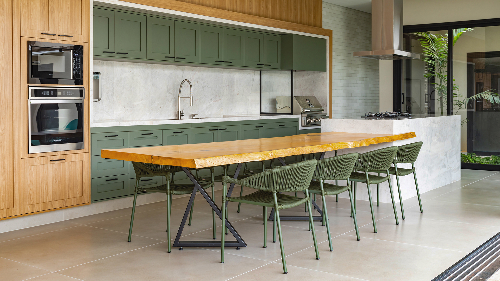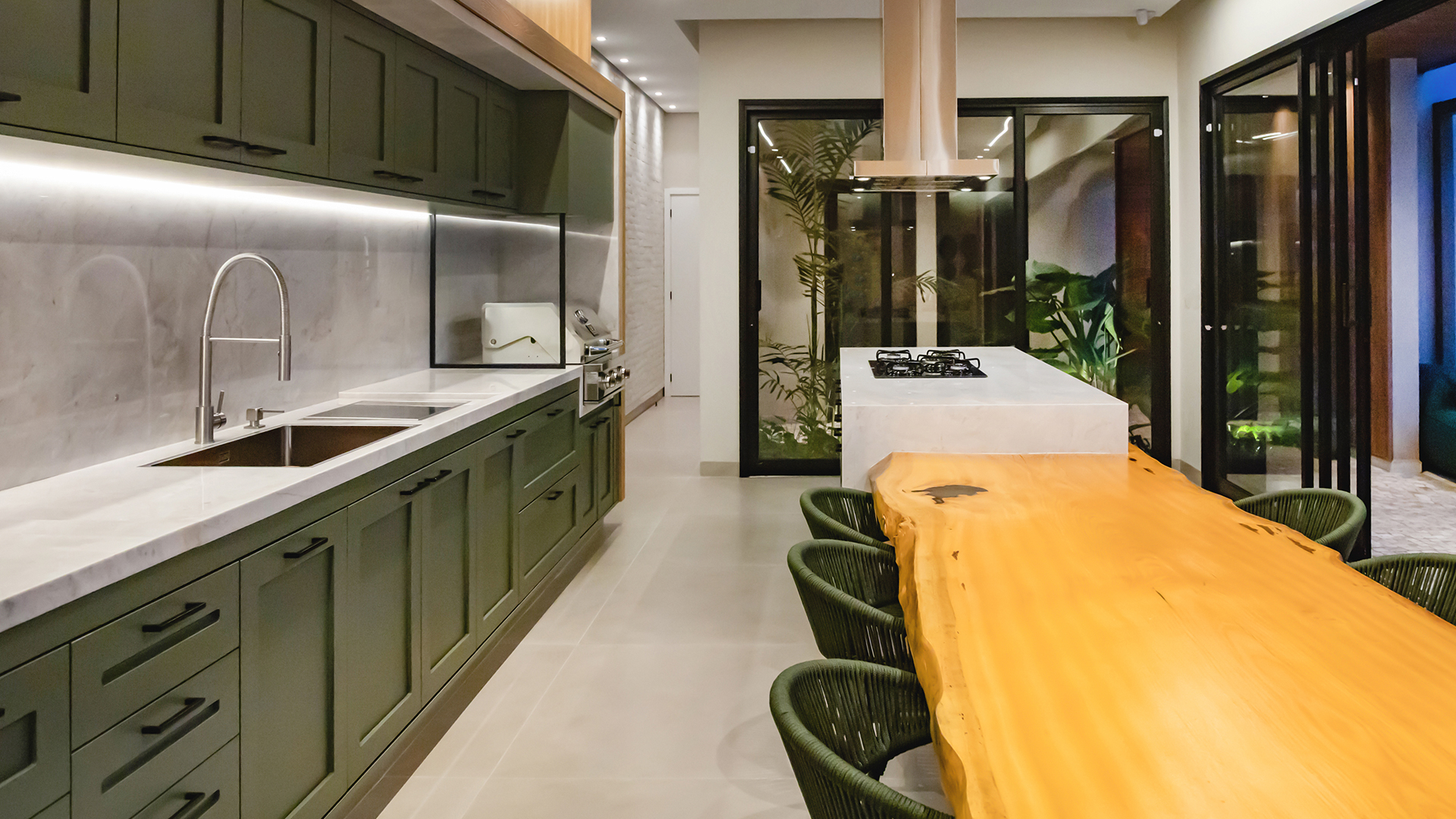 Com tons esverdeados na mobília e uma marcenaria em tom vivido, a integração do espaço em questão ocorre por conta do uso de portas e painéis móveis que, além de unificarem os ambientes, também mantem a privacidade quando necessário.