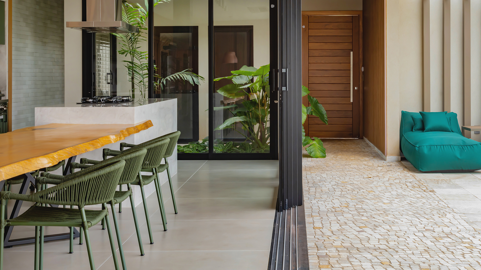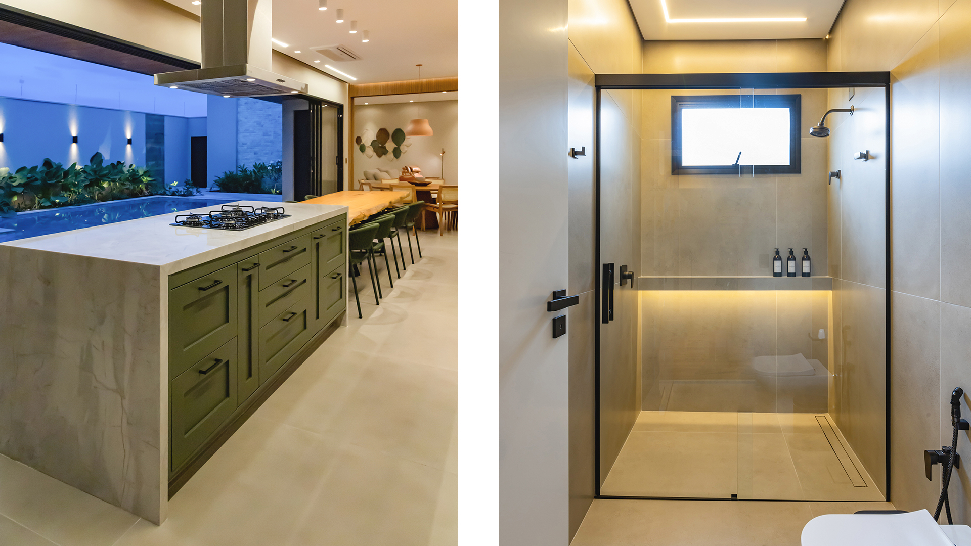 Segundo Hannah, “O porcelanato Villagres Monterrey Beige desempenhou um papel complementar na construção do conceito do projeto, reforçando a proposta de integração, leveza e atemporalidade que guiou todo o processo criativo. Sua tonalidade neutra e textura suave contribuem para a continuidade visual entre os ambientes internos e externos, fortalecendo uma estética atemporal, sensação de fluidez que faz parte da essência da residência”.